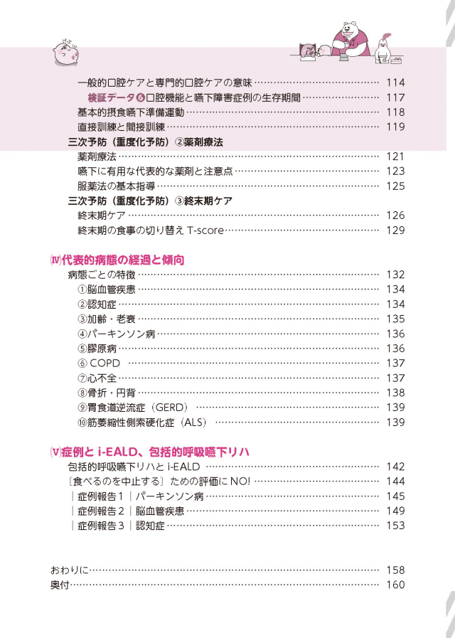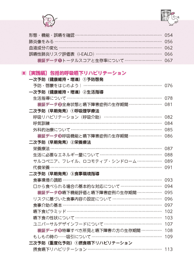 一般認知度、関心が高まってきた誤嚥性肺炎のケアにあたって、「この評価をすれば、この治療をすれば大丈夫!」ではなく、「本人が幸せに、そしてかかわっていく皆が幸せになるにはどうすればよいのか」を踏まえた“包括的呼吸嚥下リハビリテーション”の実際の取り組み方や、症例も掲載。クマ先生お手製の評価を用いた実践例をご紹介。誤嚥性肺炎に寄り添っていくには、全身をみていくこと、身体状態の変化によるかかわり方の違いなど、クマ先生が優しく解説いたします。
